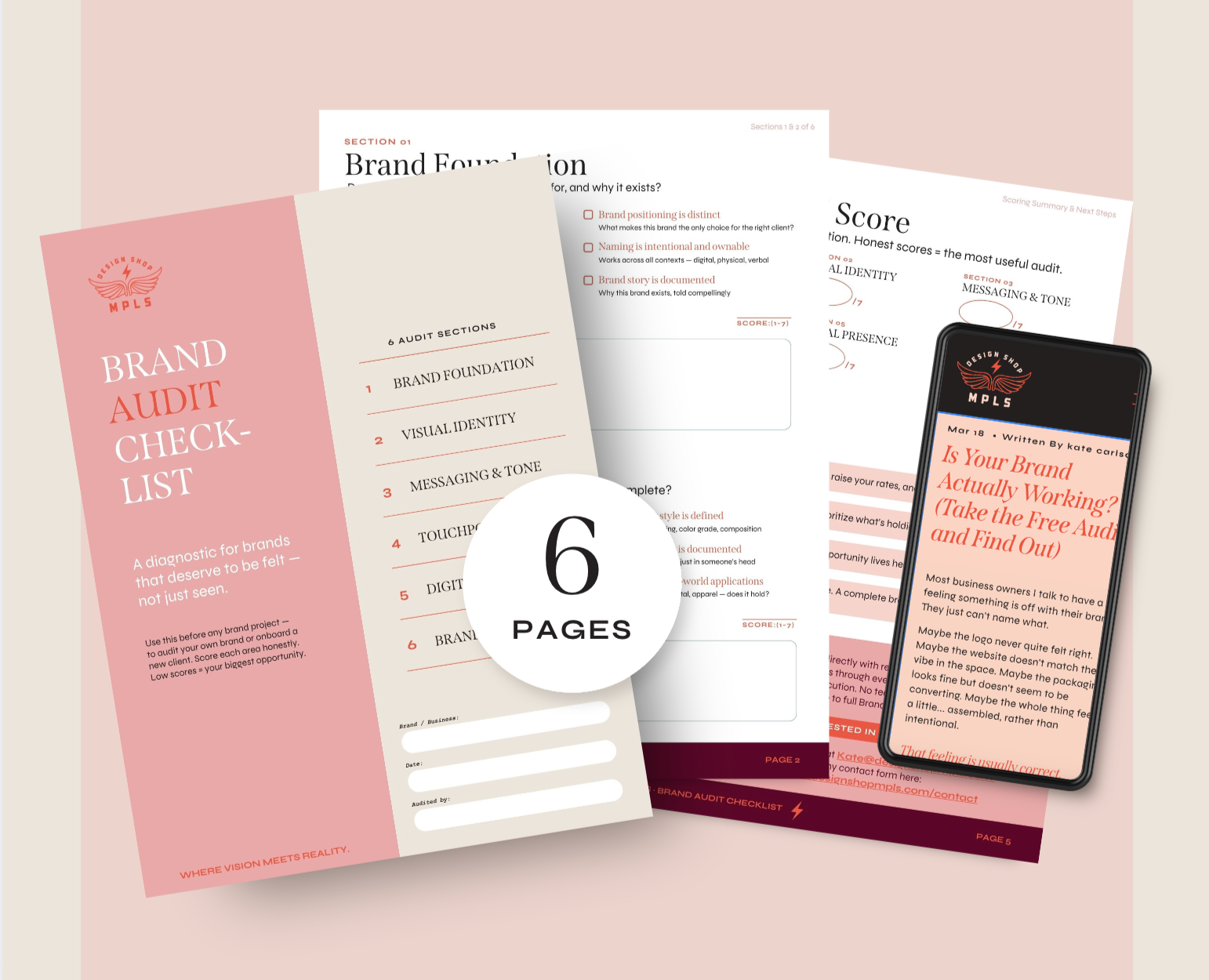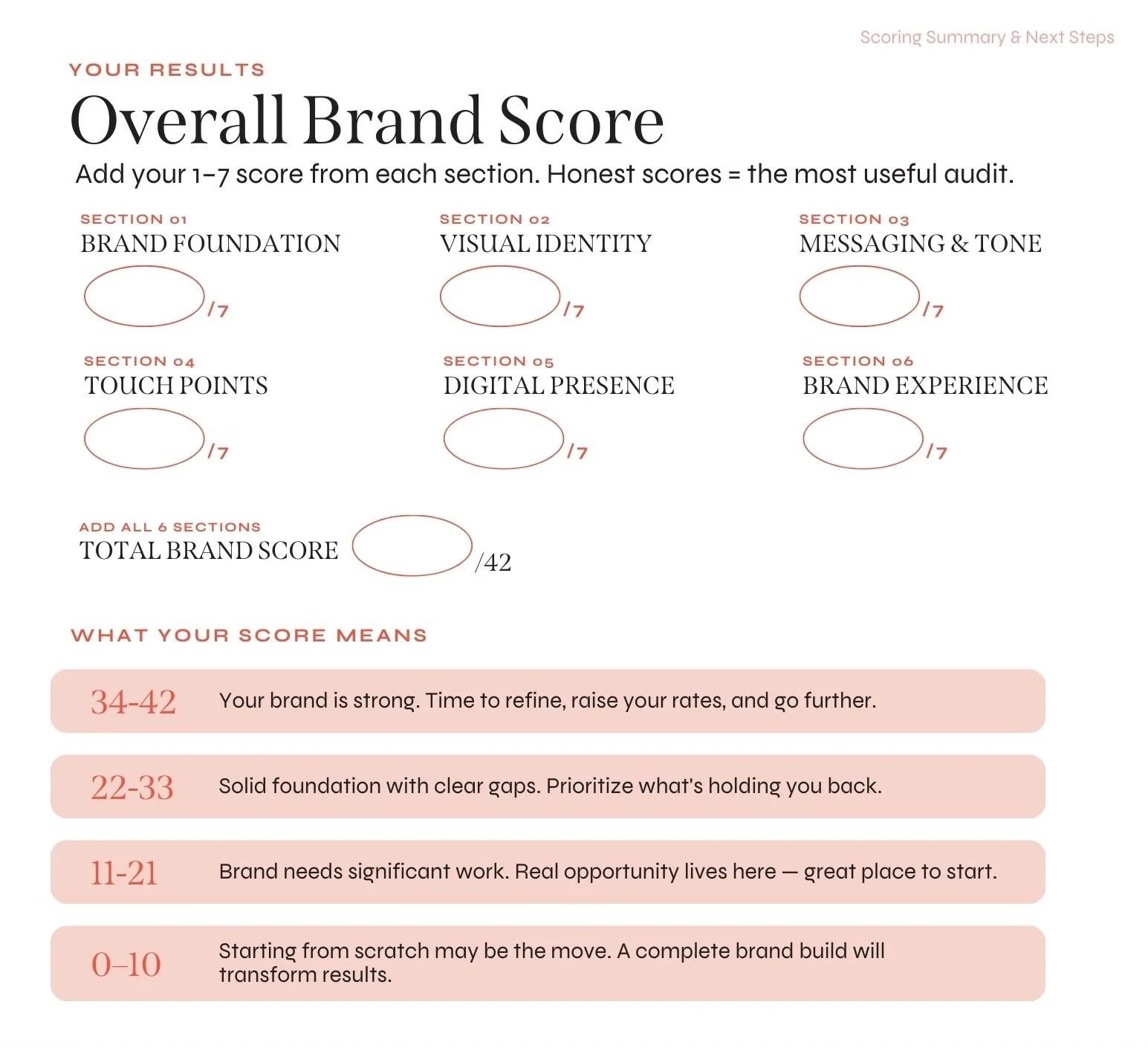 The audit walks you through six areas of your brand — the same areas I review at the start of every client project:
