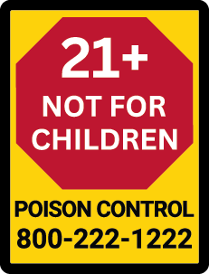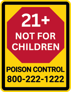 Contains a red octagon (Pantone 187C / Hex #A6192E) with "21+ NOT FOR CHILDREN" in white